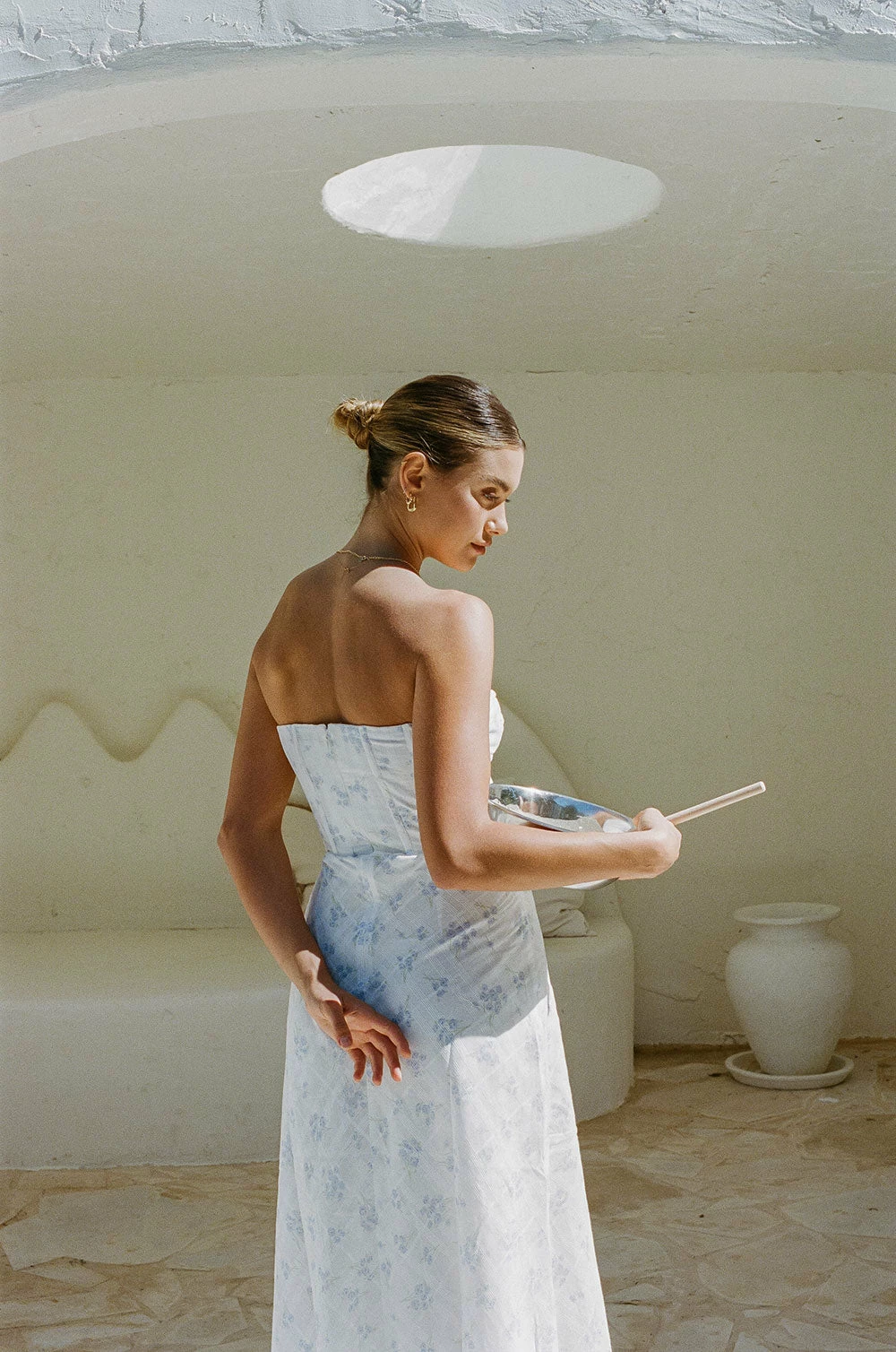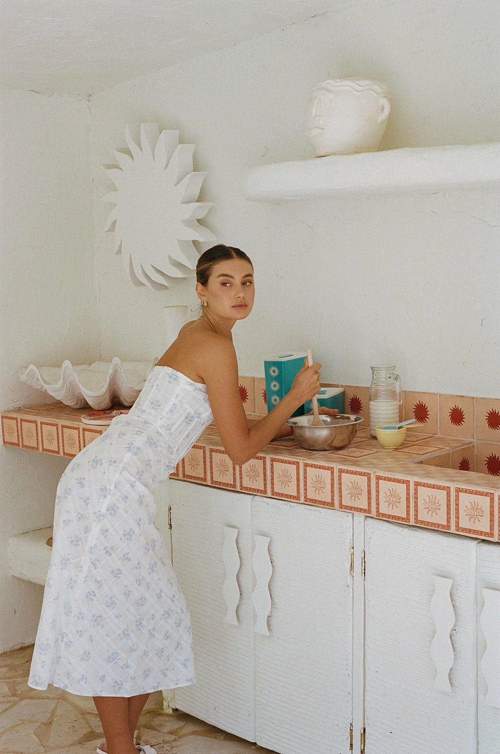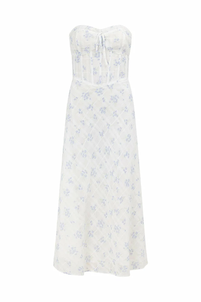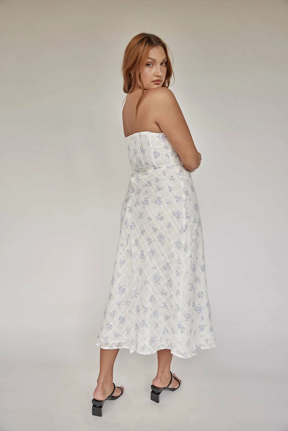 For the lovers of structure and feminine prints! The Rumer Dress is made from a delicate natural cotton fabric with our exclusive dainty bouquet print and a self check throughout. It is a strapless style featuring a tie detail at neckline, fitted boned waist and bias cut hem. Pair with white heels or sandals and the Petal Necklace! Designed exclusively by Sabo.