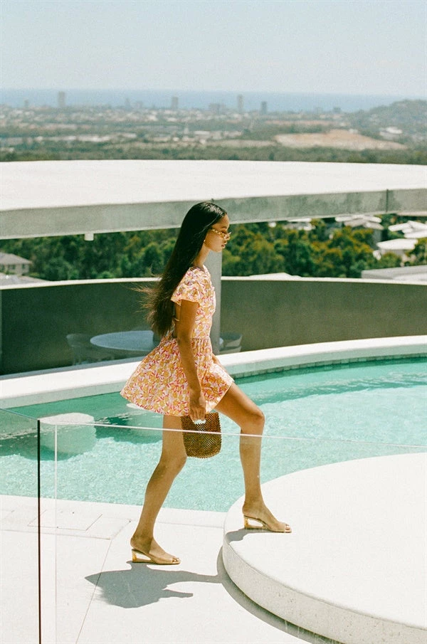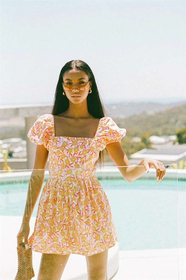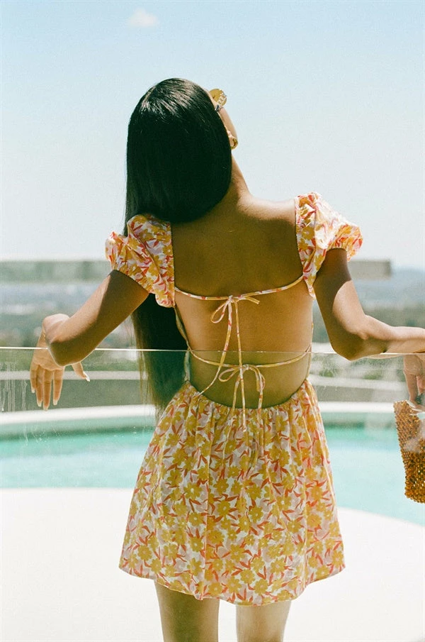 The perfect dress to take you from day-to-night. The Santa Cruz Dress is made from a high quality natural cotton fabric with our exclusive link flower print throughout. It is a backless style featuring ties at back, short puff sleeves and flouncy skirt. Dress it up with heels and Two Toned Twin Hoops! Designed exclusively by Sabo.