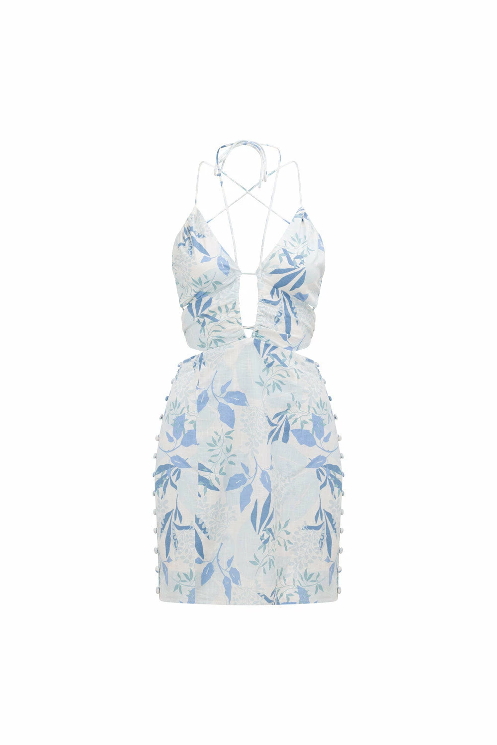 Confident girl summer, incoming! The Sayla Halter Dress is made from a natural cotton slub fabric with our exclusive Lily Bud print. It is a backless style featuring thin rouleau straps at back, neck and shoulders and cutouts at waist. Style your look with white slides! Designed exclusively by Sabo.