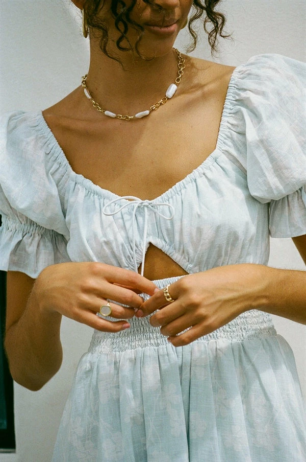 The perfect dress to take you from day-to-night! The Sia Dress features short puff sleeves with frill detailing, drawstring and cutout at centre bust, a shirred waist and flouncy skirt. Pair with the Transparent Mules and Rico Handle Bag! Designed exclusively by Sabo.