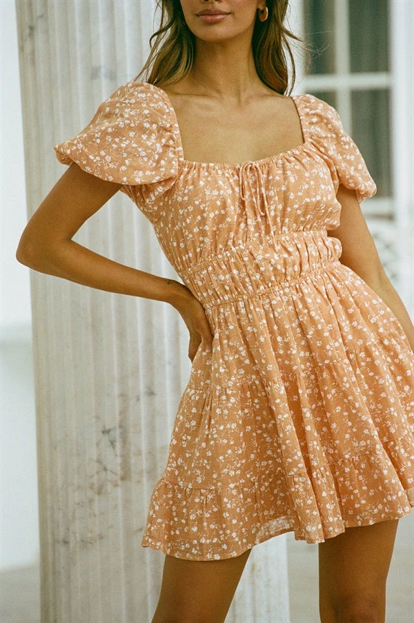 Dress it up with heels or keep it casual and pair it back with sneakers! The Talina Dress is made from a natural raw cotton cheesecloth fabric in an orange hue. It features short puff sleeves, tie at neckline, gathered bust and waist with elasticated detailing at waist and a flouncy triple tiered skirt. Pair with the Drop Link Earrings and heels for your next night out! Designed exclusively by Sabo.