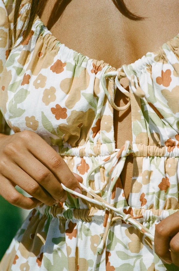 Natural fabrics and feminine designs are a match made in heaven! The Tarika Dress is made from a natural cotton fabric with our exclusive bold autumn floral print throughout. It features short flouncy sleeves, an elasticated neckline, cutouts and tie detailing at centre front and a super cute triple tiered skirt. Dress it up with the heels and a neutral handbag or keep it casual with sneakers and the a micro backpack! Designed exclusively by Sabo.