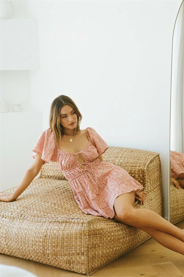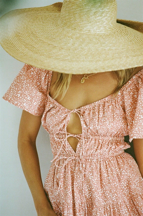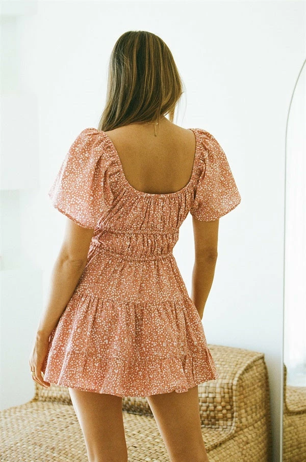 *BACK IN STOCK* Natural fabrics and feminine designs are a match made in heaven! The Tarika Dress is made from a structured linen cotton blend fabric with our exclusive mono floral print throughout. It features short flouncy sleeves, an elasticated neckline, cutouts and tie detailing at centre front and a super cute triple tiered skirt. Dress it up with the Transparent Mules and a neutral handbag or keep it casual with sneakers and the a micro backpack! Designed exclusively by Sabo.