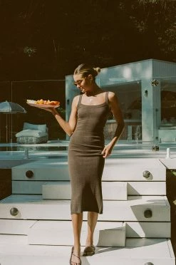 The perfect knit dress has landed! The Vallie Midi Dress is made from a cotton blend knit fabric in a chocolate brown hue. It is midi length and features ribbed trims, adjustable straps, body skimming fit and split at centre back. Dress it up with heels or keep it casual with sneakers or sandals! Designed exclusively by Sabo.