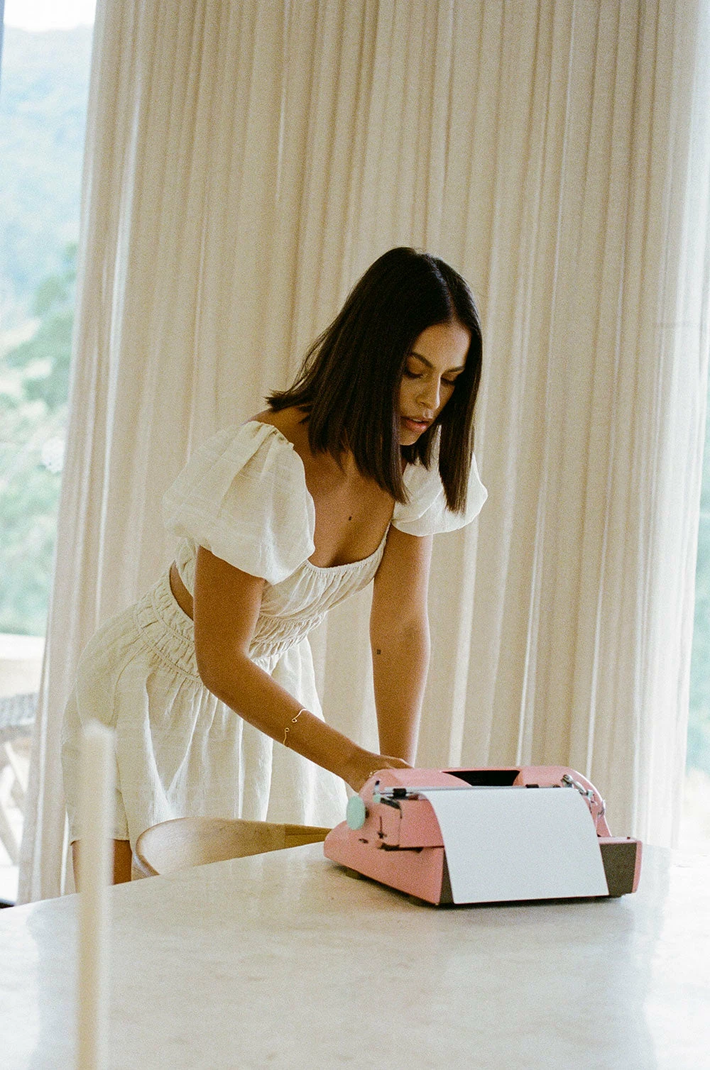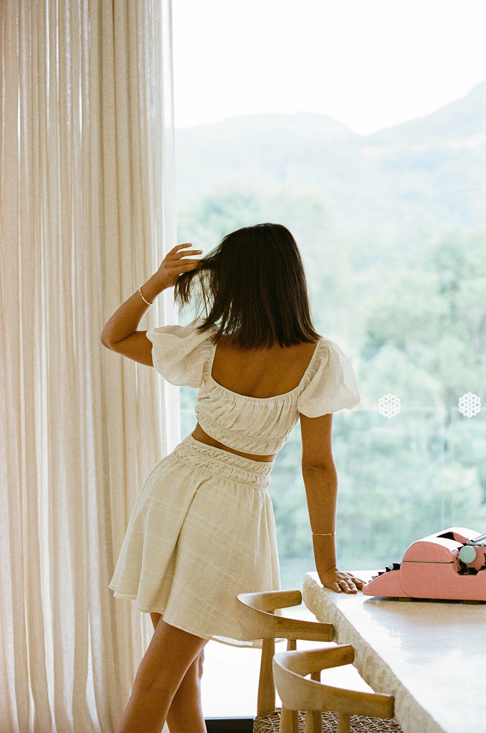 Keep it casual with sandals or dress it up with heels! The Wolfie Dress is made from a lightweight beige fabric with slight stripe detail throughout. It features short puff sleeves, scoop neckline, cutout at waist and elastic detailing across waist. Designed exclusively by Sabo.