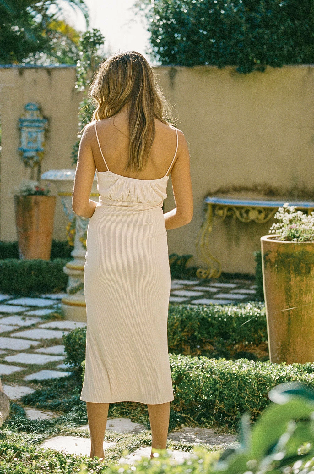 The perfect look for our neutral lovers! The Zephyr Midi Dress is made from a ribbed fabric in a champagne beige hue. It is a midi style featuring thin straps with tie detail at centre neckline. Style with neutral heels and bag and gold accessories! Designed exclusively by Sabo.