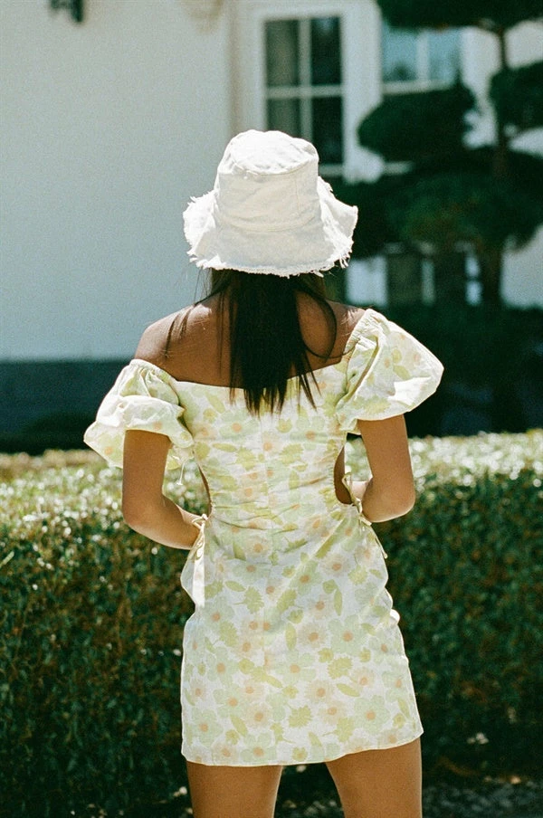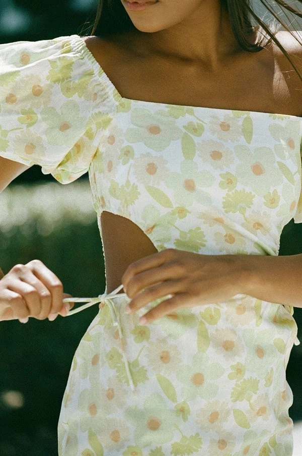 The Zola Dress, with cutouts in all the right places! Made from a high quality linen cotton blend fabric with our exclusive citrus floral print, it features cutouts at sides of waist, straight neckline and short puff sleeves. Can be worn off or on shoulder! Designed exclusively by Sabo.